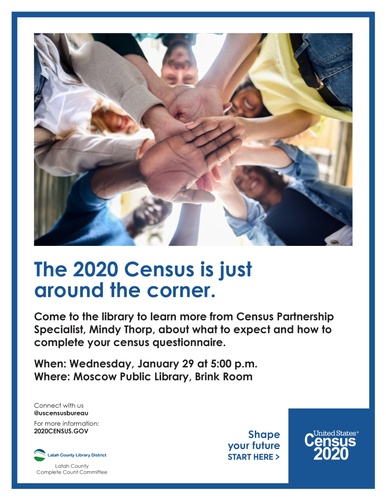The 2020 Census is just around the corner! The public is invited by the Latah County Library District to learn more from Census Partnership Specialist Mindy Thorp about the history of the Census, fun facts, what to expect and how to complete the census questionnaire.
