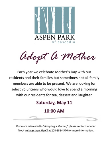 If you are interested in “Adopting a Mother,” please contact Jennifer Trout no later than May 7 at 208-882-4576 for more information.