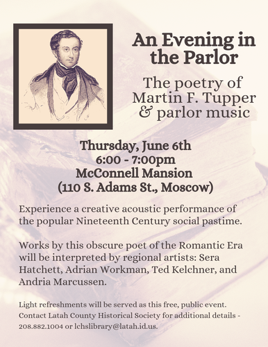 Please join us for an evening in the parlor of Moscow's historic McConnell Mansion and delight in the poetry of Martin F. Tupper. Experience a creative acoustic performance of the popular Nineteenth Century social pastime. Works by an obscure poet of the Romantic Era, Martin F. Tupper, will be interpreted by regional artists Sera Hatchett, Adrian Workman, Ted Kelchner, and Andria Marcussen. Tupper was a British poet whose life spanned most of the 19th century. At the height of his career in the mid-1800s, he sold nearly a million copies of his work in the United States. By the time of his death in 1889, however, he had largely been forgotten. The evening's program will cast a light on this treasure of a by-gone era. Light refreshments will be served as this free, public event.