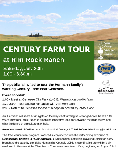 For more than 100 years the Hermann family has farmed outside of Genesee. Charles Hermann began operations in 1909 on the property that today is known as Rim Rock Ranches. Third and fourth generation Hermanns, Jim and Ben, now work and care for more than 2,700 acres. In 2017 the family’s dedication was recognized with a Century Farm Award, presented by the Idaho State Historical Society. On the afternoon of Saturday, July 20 the public will have a unique opportunity to tour this working Century Farm. Those interested in the event should plan to meet at the Genesee City Park (140 E. Walnut St.) at 1:00pm to carpool to the Hermann farm, located about 15 minutes outside of town. Jim Hermann will lead an on-site tour and share his insights on how farming has changed over the last 100 years, how Rim Rock Ranch is practicing innovative land conservation methods today, and what the future of agriculture may hold. Participants will return to Genesee by 3:30pm for a reception hosted by Pacific NW Coop, with light fare featuring locally produced ingredients. This event is free and open to the public. Attendees are encouraged to RSVP to the Latah County Historical Society. The program is offered in conjunction with the forthcoming exhibition of Crossroads: Change in Rural America, a Smithsonian Institution Traveling Exhibition show brought to the state by the Idaho Humanities Council. LCHS is coordinating the exhibit’s six week run in Moscow at the Chamber of Commerce downtown office, beginning on August 23rd. For additional information or to RSVP please contact the historical society at 208-882-1004 or lchslibrary@latah.id.us.