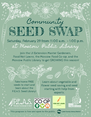 The public is invited to join the UI Extension Master Gardeners, Food Not Lawns, and the Moscow Food Co-op on Saturday, February 29 from 11:00am - 1:00pm at Moscow Public Library for a Community Seed Swap!