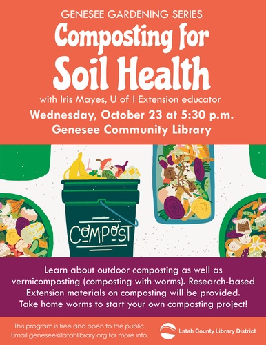 Aspiring gardeners are invited to the Genesee Community Library for the latest in Genesee’s Gardening Series: Composting for Soil Health, presented by University of Idaho Extension Educator Iris Mayes on Wednesday, October 23 at 5:30pm. Attendees will learn about outdoor composting, and vermicomposting (composting with worms). Research-based Extension materials on composting will be provided. Participants can take home worms to start their own projects.