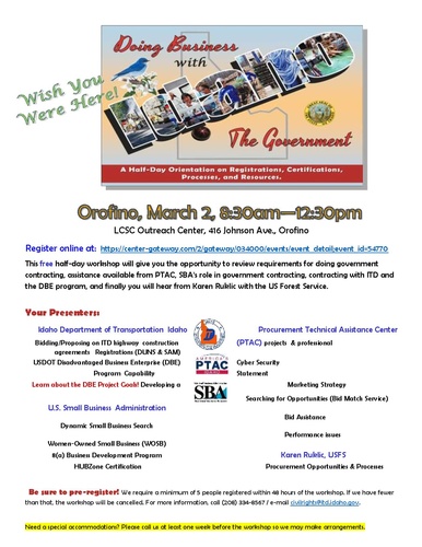 This free half-day workshop will give you the opportunity to review requirements for doing government contracting, assistance available from PTAC, SBA’s role in government contracting, contracting with ITD and the DBE program, and finally you will hear from Karen Ruklic with the US Forest Service.