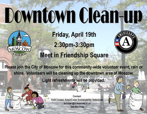 Join the City of Moscow for this community-wide volunteer event, rain or shine. Volunteers will be cleaning up the downtown area of Moscow. Light refreshments will be provided.