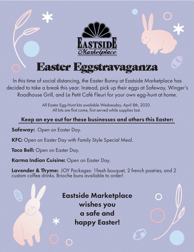 In this time of social distancing, the Easter Bunny at Eastside Marketplace has decided to take a break this year. Instead, pick up their eggs at Safeway, Winger's Roadhouse Grill, and Le Petit Cafe Fleuri for your own egg-hunt at home. All Easter Egg-Hunt kits will be available Wednesday, April 8. All kits are first come, first served while supplies last.