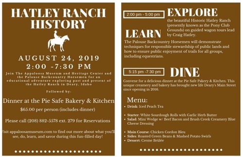Join the Appaloosa Museum and Heritage Center and the Palouse Backcountry Horsemen for an educational adventure exploring past and present of the Hatley Ranch in Deary, Idaho. This excursion will be followed by dinner at the Pie Safe Bakery in Deary, Idaho. Visit appaloosamuseum.com to find out more about what you'll see, do, learn, and savor during this fun-filled day!