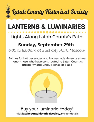 The Latah County Historical Society will celebrate its 51st Anniversary with “Lanterns & Luminaries” on Sunday, September 29, from 6:00pm – 8:00pm, at East City Park. This second annual event provides a way to acknowledge the people, places, and organizations that have made and continue to make Latah County a remarkable place to live, work, and grow. Join us for the lighting of the luminaria at 6:00pm, while enjoying hot beverages and homemade desserts. Lanterns are currently on sale for $10, with honorees and donors listed in the commemorative program booklet, available to purchase for $5 (lanterns must be ordered by September 24 to be included in the booklet). Visit latahcountyhistoricalsociety.org to purchase online, or stop by the Centennial Annex at 327 East 2nd St in Moscow. Funds raised from this fun and family friendly event go toward the continued preservation of our county’s unique history.