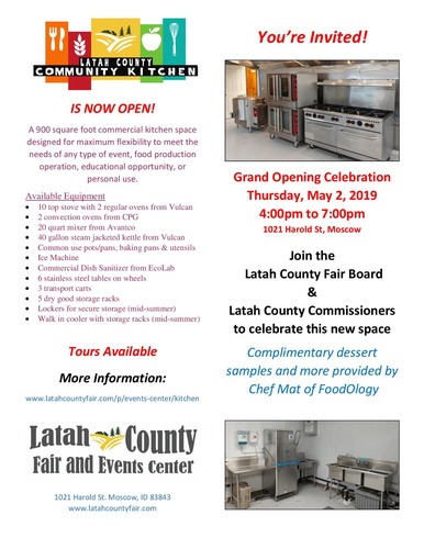 This 900-square-foot commercial kitchen space designed for maximum flexibility to meet the needs of any type of event, food production operation, educational opportunity, or personal use is now open at the Latah County Fairgrounds!