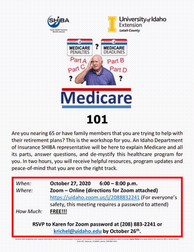 Are you nearing 65 or have family members that you are trying to help with their retirement plans? This is the workshop for you. An Idaho Department of Insurance SHIBA representative will be here to explain Medicare and all its parts, answer questions, and de-mystify this healthcare program for you. In two hours, you will receive helpful resources, program updates and peace-of-mind that you are on the right track.