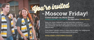 You're invited to Moscow Friday! Come mingle on Main Street Friday evening from 5:00 p.m. to 7:00 p.m., the night before UIdaho Bound.