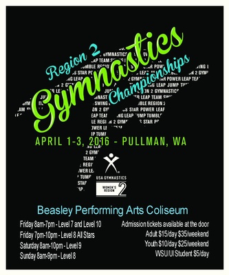 Palouse Empire Gymnastics will be hosting the Region 2 Gymnastics Championships from April 1 through April 3, 2016 at the Beasley Performing Arts Coliseum in Pullman, WA. This event will bring 500 of the top gymnasts from Washington, Oregon, Idaho, Montana, Hawaii, and Alaska, all trying to qualify for Nationals.