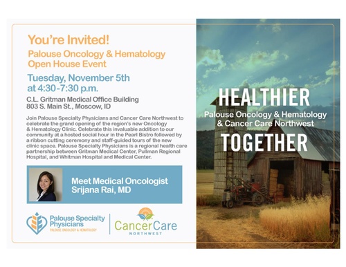 Join Palouse Specialty Physicians and Cancer Care Northwest to celebrate the grand opening of the region's new Oncology & Hematology Clinic. Celebrate this invaluable addition to our community at a hosted social hour in the Pearl Bistro followed by a ribbon cutting ceremony and staff-guided tours of the new clinic space. Palouse Specialty Physicians is a regional health care partnership between Gritman Medical Center, Pullman Regional Hospital, and Whitman Hospital and Medical Center.