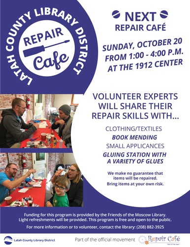 Community members are invited to bring their broken objects and a can-do spirit to the Moscow Public Library’s Repair Café on Sunday, October 20, from 1:00pm – 4:00pm at the 1912 Center. Volunteer experts will share their skills with visitors to repair books, clothing and textiles, small household appliances, toys, and other items. In addition, there will be a gluing station with a variety of glues. There is no guarantee that items will be properly repaired. Attendees bring items at their own risk.