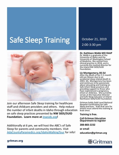 Join our afternoon Safe Sleep training for healthcare staff and childcare providers and others. Help reduce the number of infant deaths in Idaho through education on safe sleep practices presented by NW SIDS/SUID Foundation. Learn more at inwsids.org!