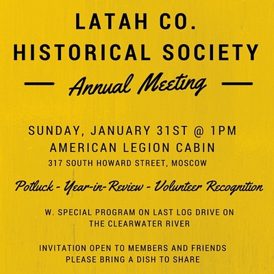 The Latah County Historical Society's Annual Meeting will take place in the American Legion Log Cabin (317 South Howard Street, Moscow) on January 31st from 1:00 - 4:00 p.m. Join us as we honor the hard work of our volunteers, review events of the past year, and discuss our plans and goals for 2016. Special guest Sandy Goffinet will share a visual history of the last log drive on the Clearwater River.