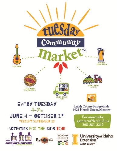 The Tuesday Community Market on August 6 runs from 4:00pm-7:00pm at the Latah County Fair and Event Center.