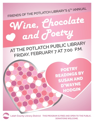 Potlatch community members are invited to Friends of the Potlatch Library’s fifth annual Wine, Chocolate, and Poetry event at the Potlatch Public Library on Friday, February 7 at 7:00pm. There will be poetry readings by Susan and D’Wayne Hodgin.