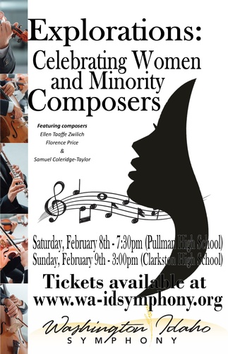 The Washington Idaho Symphony is celebrating Woman and Minority composers with their February concert, Explorations, and are proud to highlight this under-represented segment of the music industry. The symphony will be performing pieces by Fanny Mendelssohn, Jennifer Jolley, Ellen Taaffe Zwilich, and Florence Price. In addition, soloists will be highlighted within the orchestra. Join other music lovers in February to hear the music of Woman and Minority composers!
